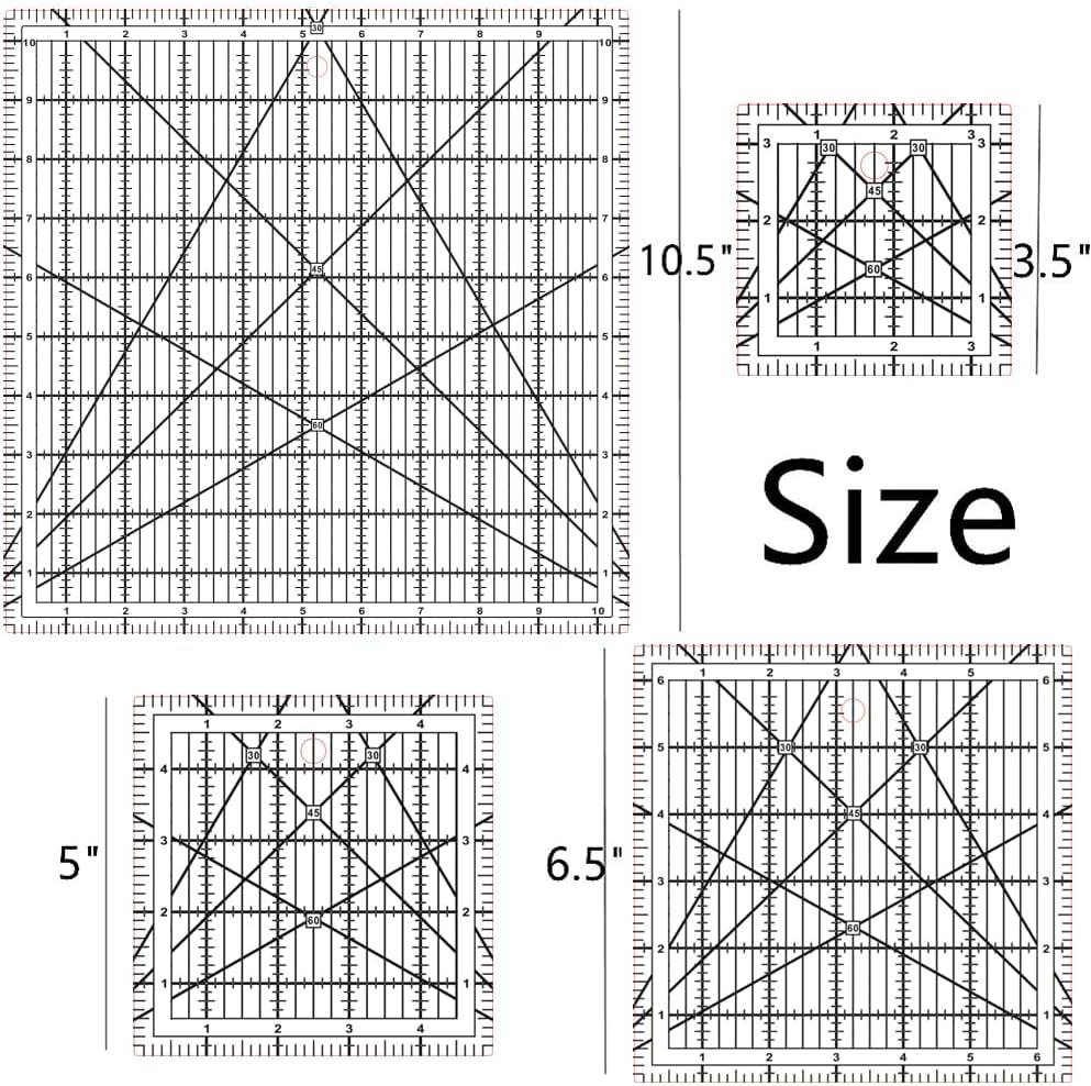 Introducing the ultimate set of Quilting Rulers and Templates for all your quilting projects! This set includes 4 Quilting Templates Square Rulers in varying sizes – 3.5 inches, 5 inches, 6.5 inches, and 10.5 inches – to cater to all your quilting needs.